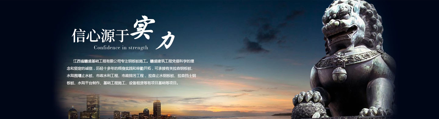 江西省赣盛基础工程有限公司钢板桩施工。赣 盛建筑工程凭借科学的理念和坚定的诚信,历经十多年的倾身实践和辛勤开拓,可承接有关拉森钢板桩、水陆围堰止水桩、市政水利工程、市政排污工程 、拉森止水钢板桩、拉森挡土钢板桩、水陆平台制作、基础工程施工、设备租赁等有项目基础等项目。 ...